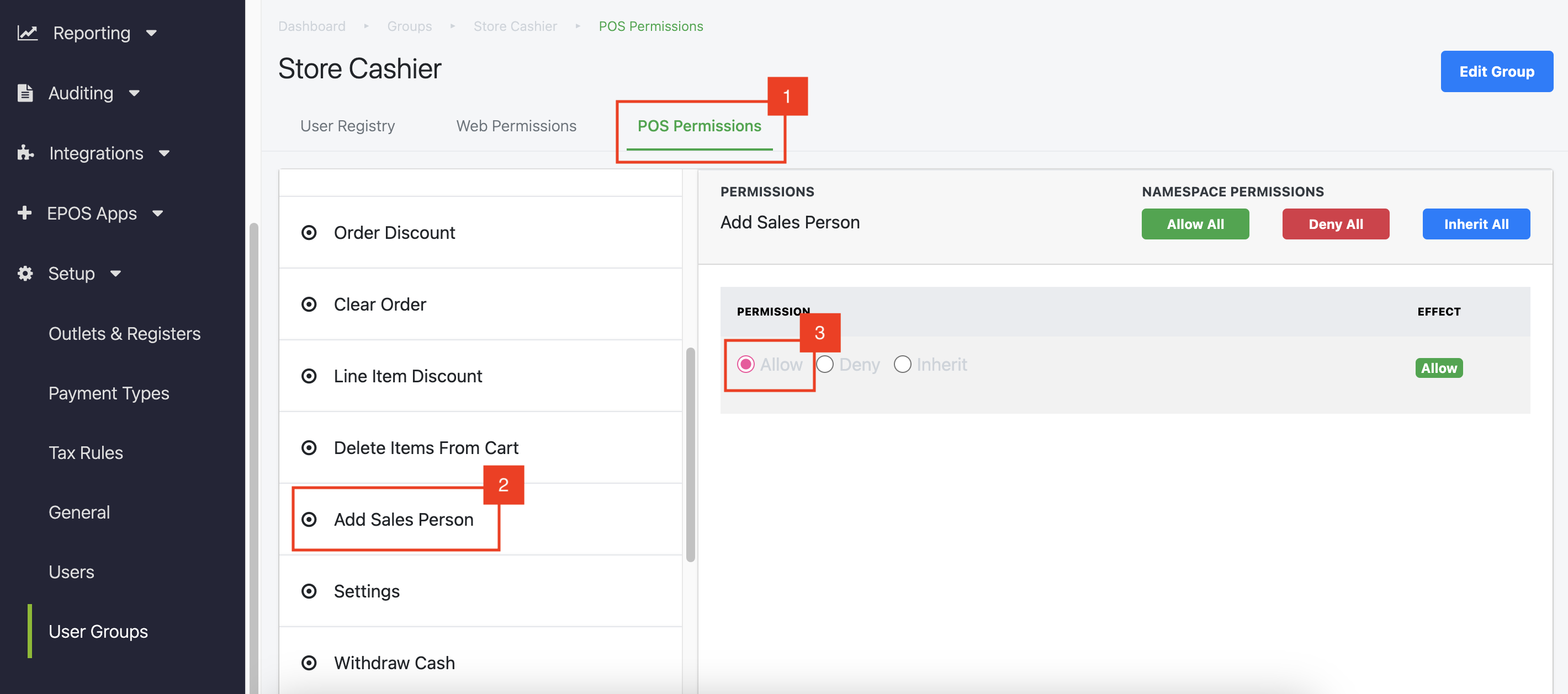 Users can select POS Permissions and can navigate to ‘Add Sales Person’ and click on the Allow button