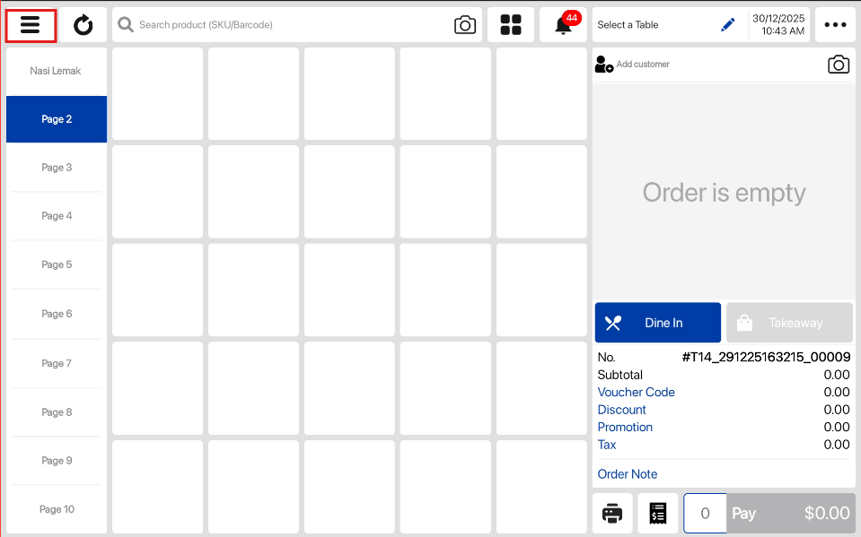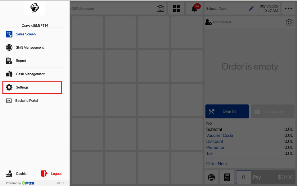 2. Select Settings from the side menu on the sales screen.