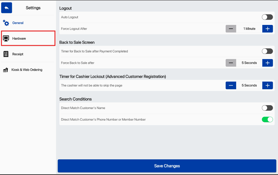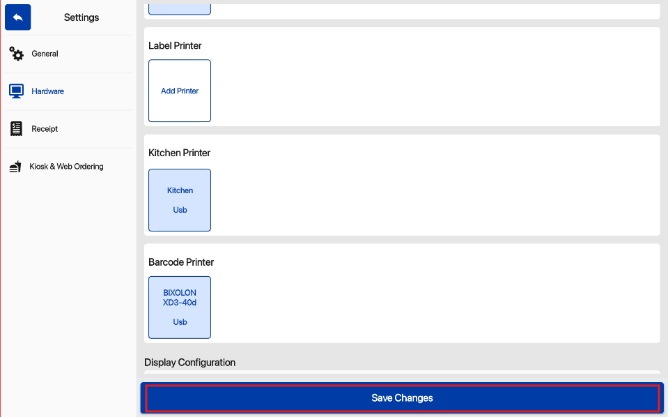 8. Select Save Changes on the Hardware page to confirm the setup