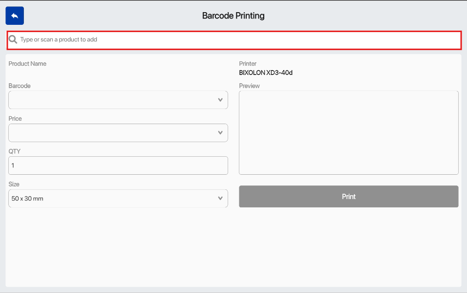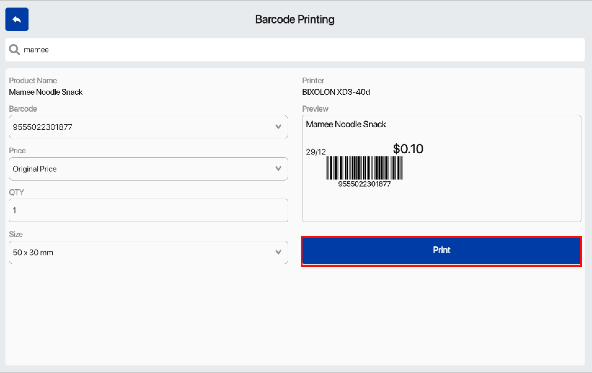 3. Barcode Printing Page when a product is added