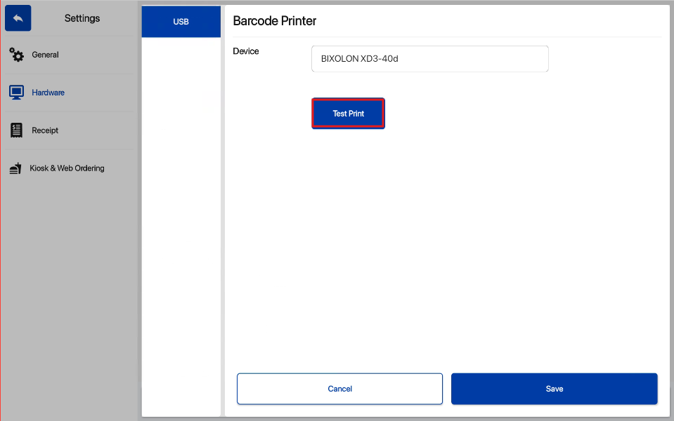 6. Select Test Print to validate USB printer setup.