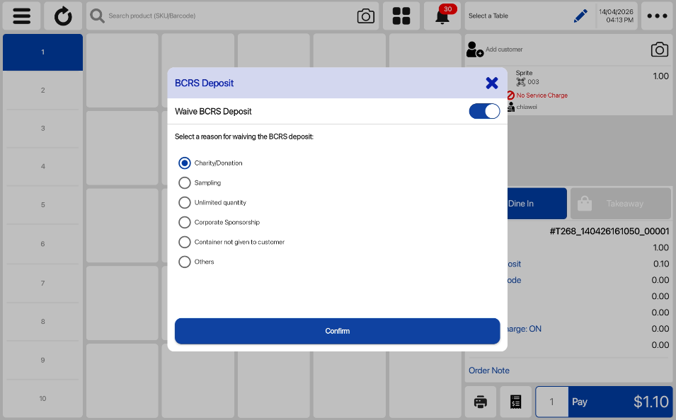 Note: If you need to change the waiver reason after confirming, you can click the “BCRS Deposit” label again and update the reason before completing payment. The receipt will only print the most recently confirmed waiver reason.