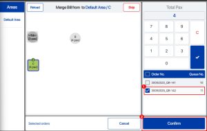 Users can click on orders using the checkboxes under the Order No section after selecting the other table and click on the Confirm button to merge bills for both tables.