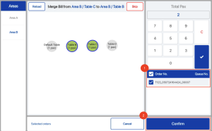 Users can click on orders using the checkboxes under the Order No section after selecting the other table and click on the Confirm button to merge bills for both tables.