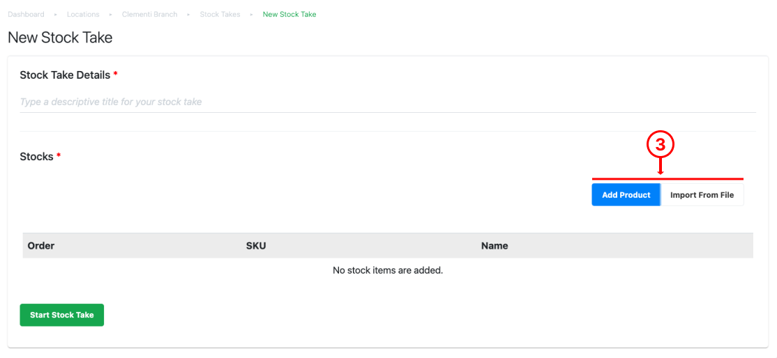 2. Users will be directed to the New Stock Take page. Here, users should first enter a name or reference for the stock take session.