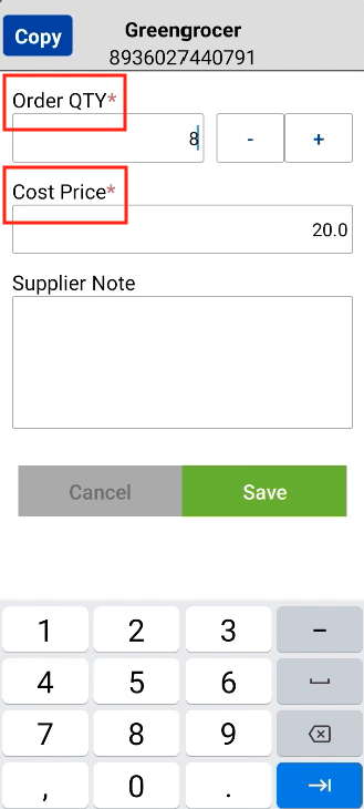 6. After product(s) are added, enter supplier note, order qty, and cost price.