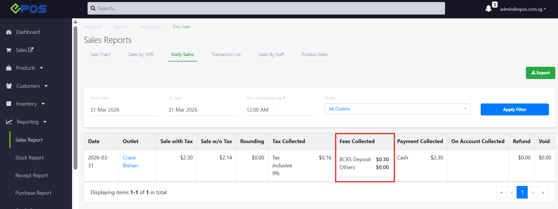 Allow users to generate a Daily Sales Report based on a specific date range and outlets. Users can also set the timing of the start of the store’s business day. Click on Apply Filter to generate a report.