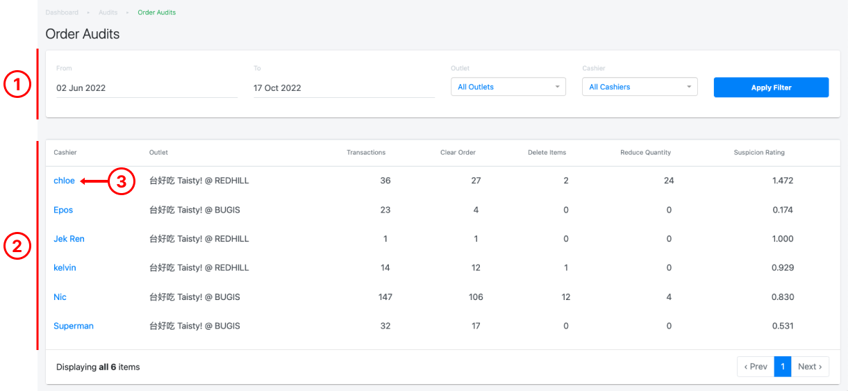 Shows the staff, outlet, number of transactions processed, number of times an order was cleared, deleted items, and reduced quantity. Based on these factors, a suspicion rating will be tabulated for every staff