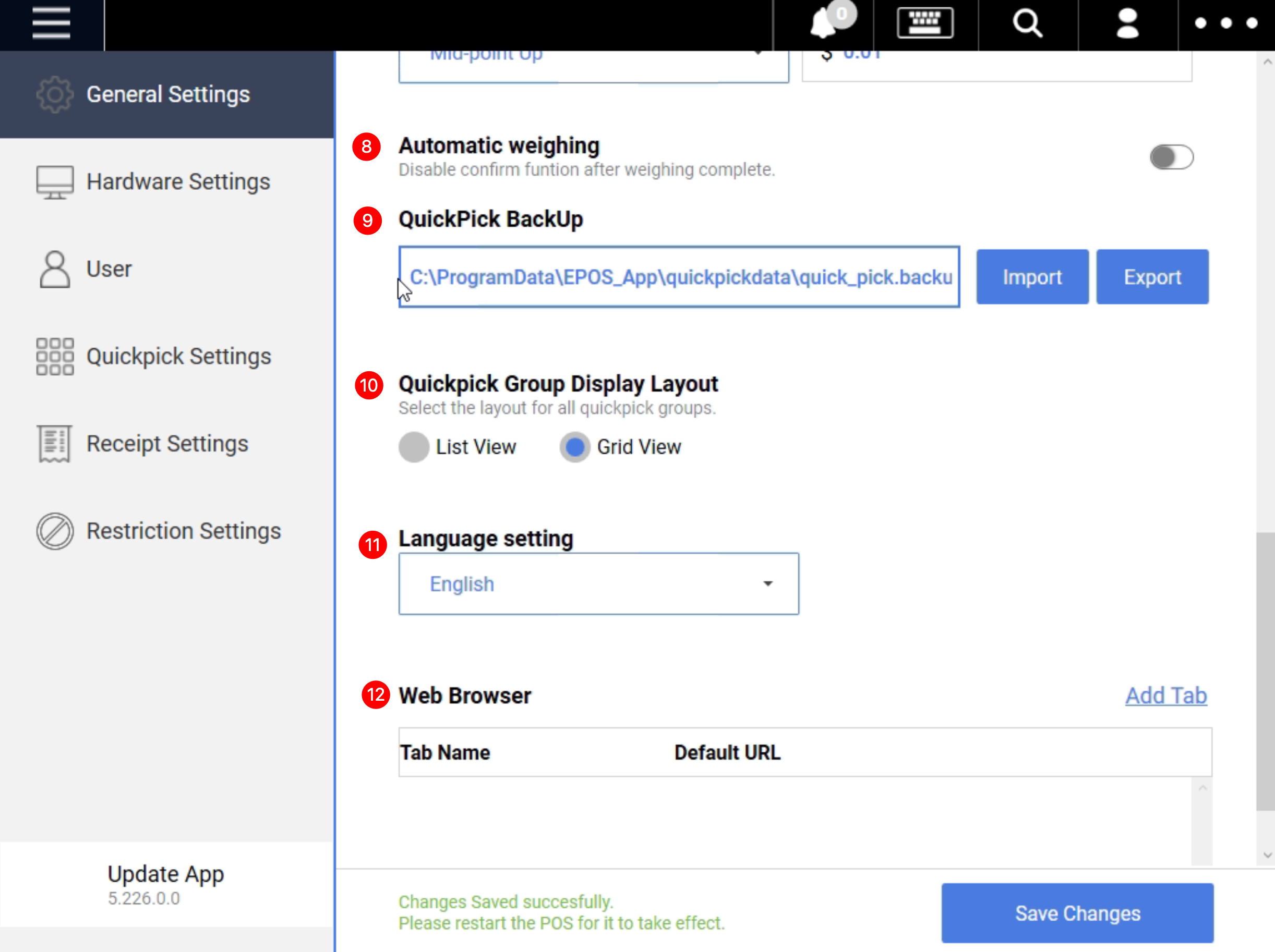 After select the language user wants, user should click on “Save Changes”, “Close App” and restart EPOS POS again: