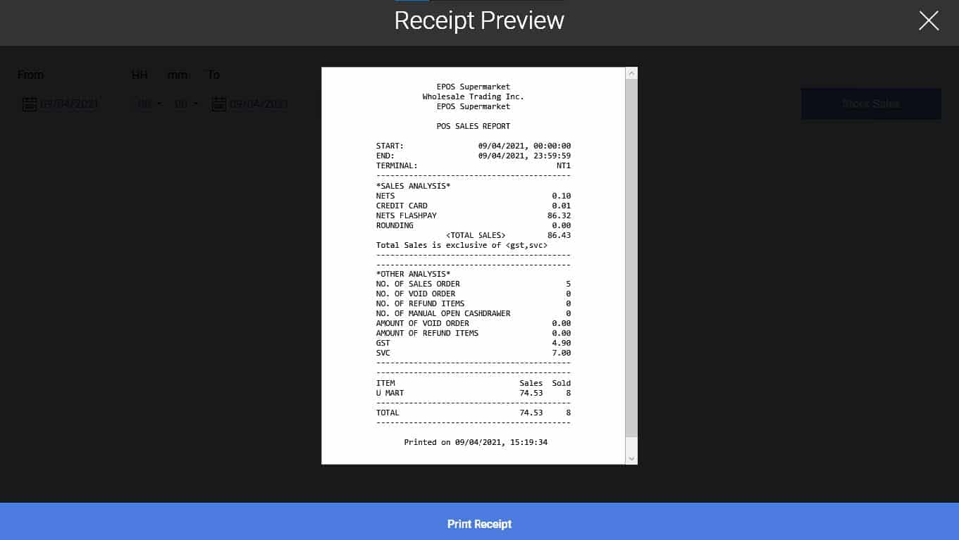 2. Click on Preview to view the sales report. A window will be shown. Users can click on Print Receipt to print the sales report.
