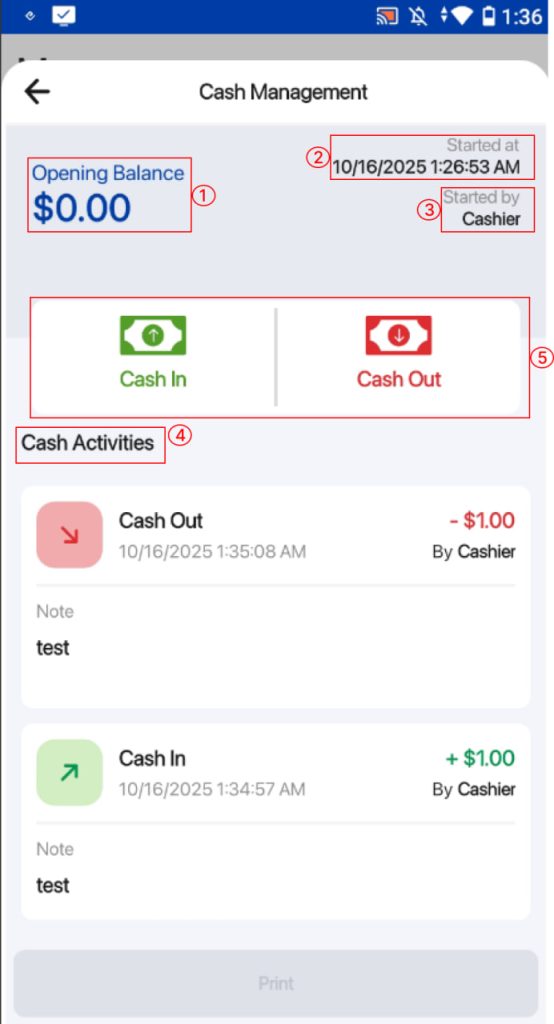 Users can perform Cash In or Cash Out transactions directly from the frontend POS. This feature allows easy tracking of cash movements during shifts.