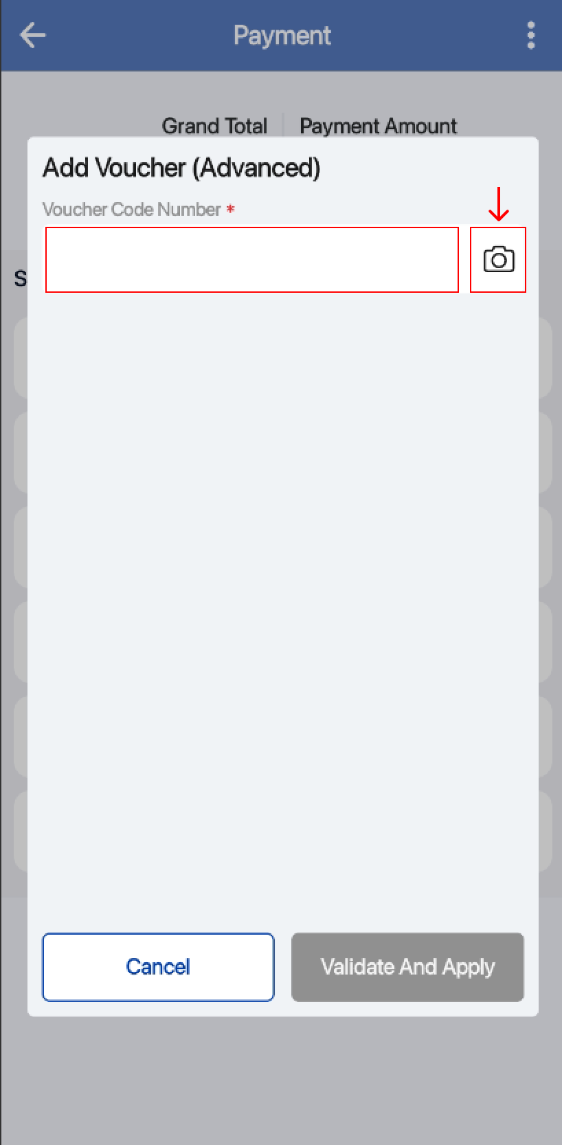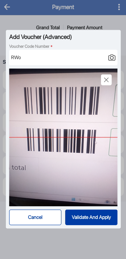 Users can scan the barcode or enter the Voucher Serial Number and the system will automatically display the Voucher Amount. Then click on the Validate and Apply button.