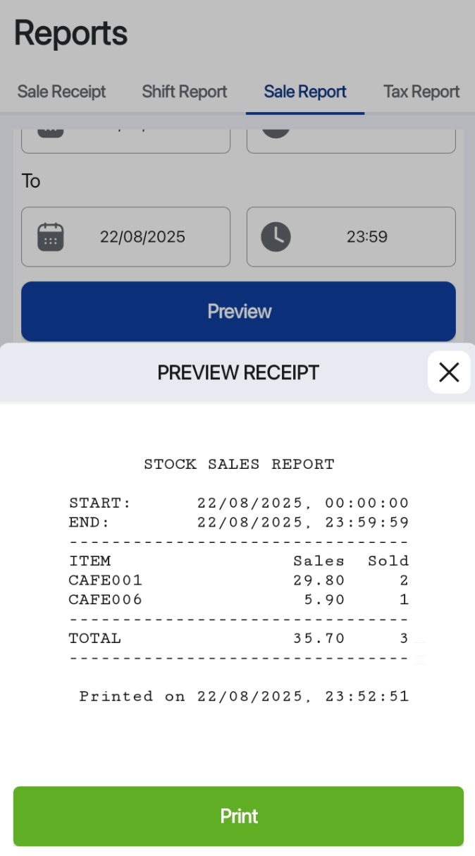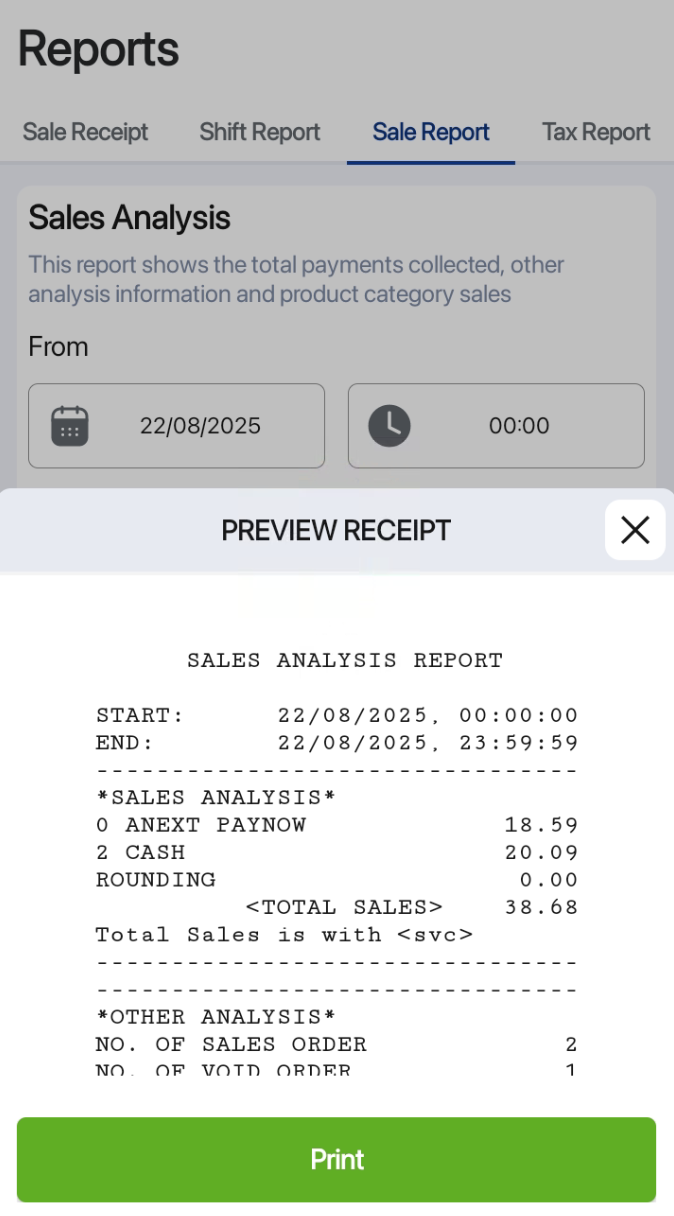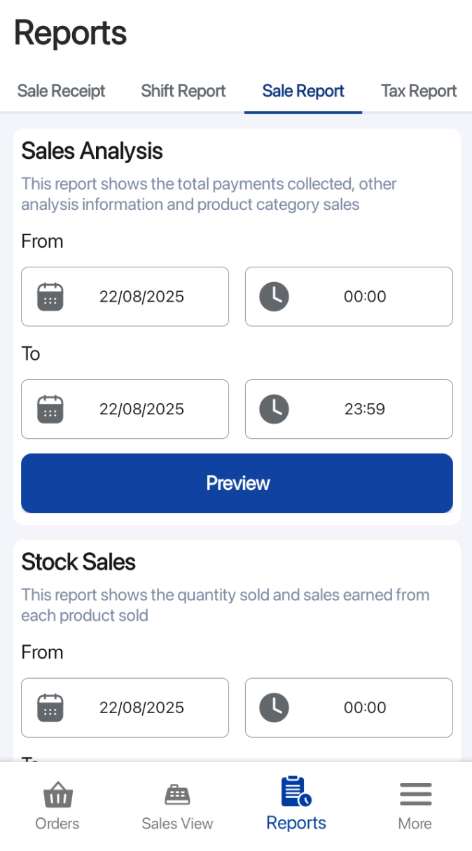 Under Sale Report, users are able to view and print Sales Analysis and Stock Sales based on the selected date and time filters.