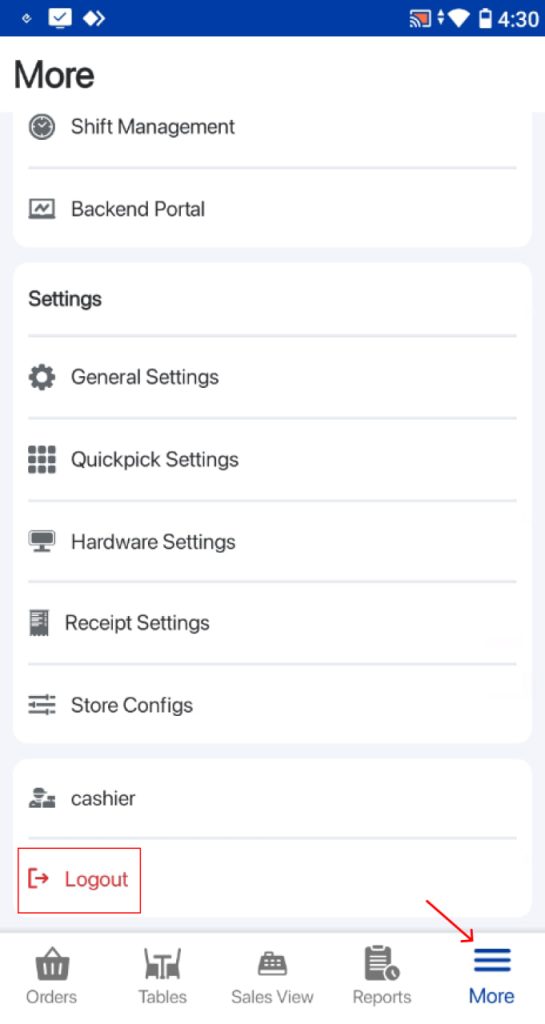 When users would like to log out, users can click on ‘More’ in the taskbar to enter the POS More menu. After entering the POS More menu, users can scroll down and click on the Logout button.