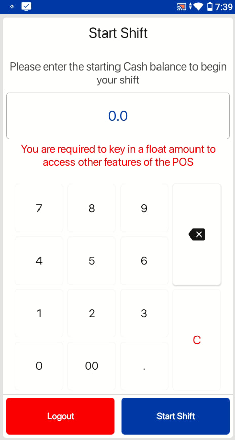 To start a shift, User can use the number pad to insert the amount of starting cash (float money).