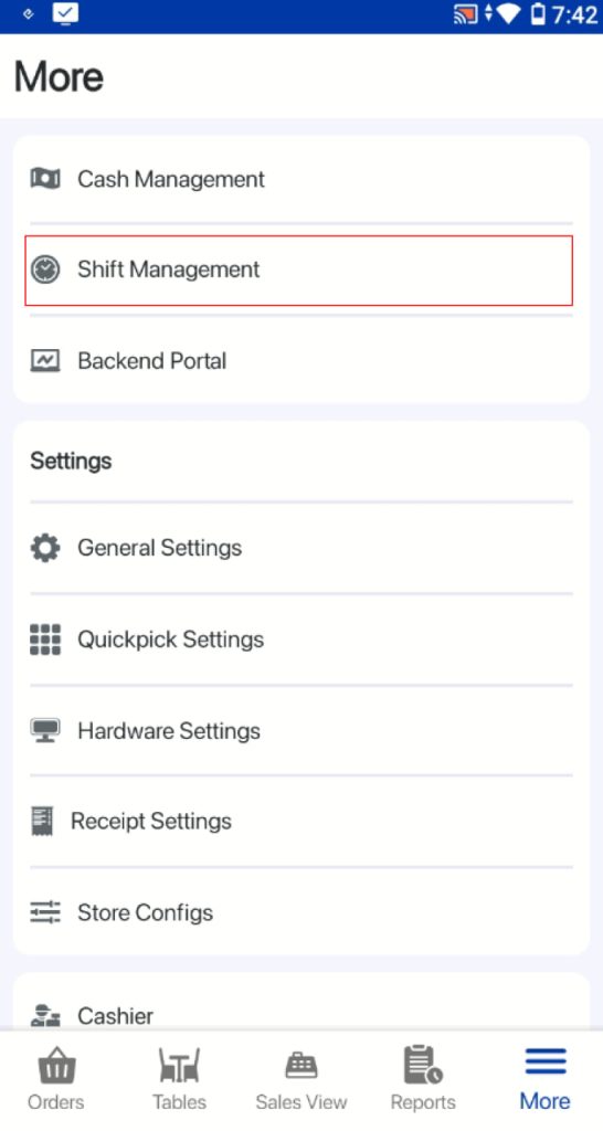 To end shift, user click on ‘More’ in the taskbar, then shift management.