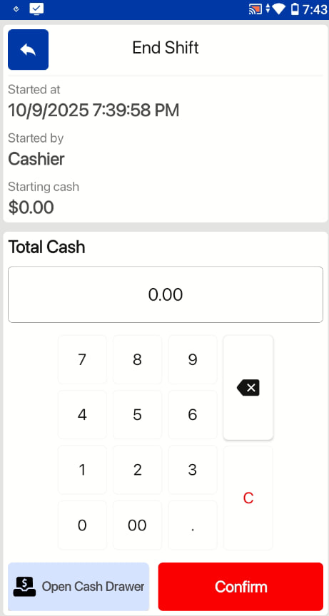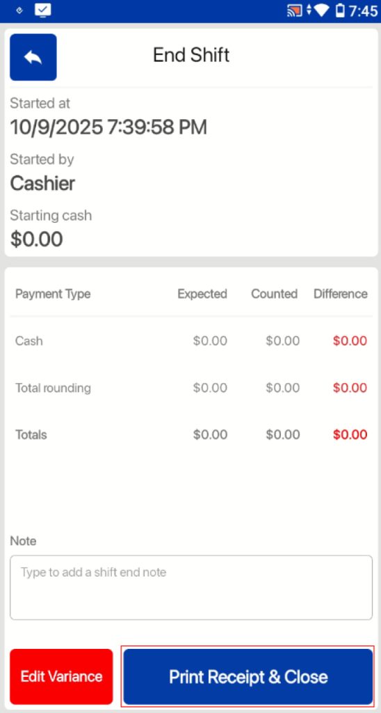 After inserting the total amount, users can click on the Confirm button and end the shift by tapping on Print Receipt & Close.