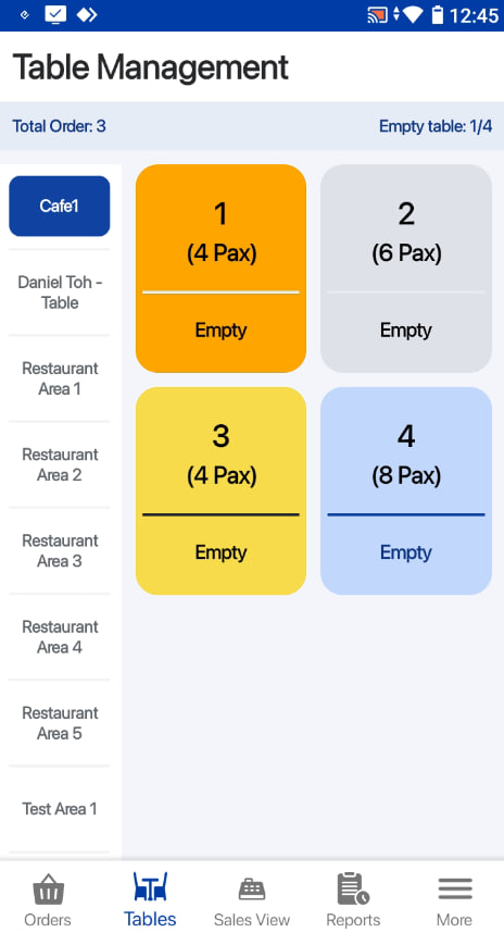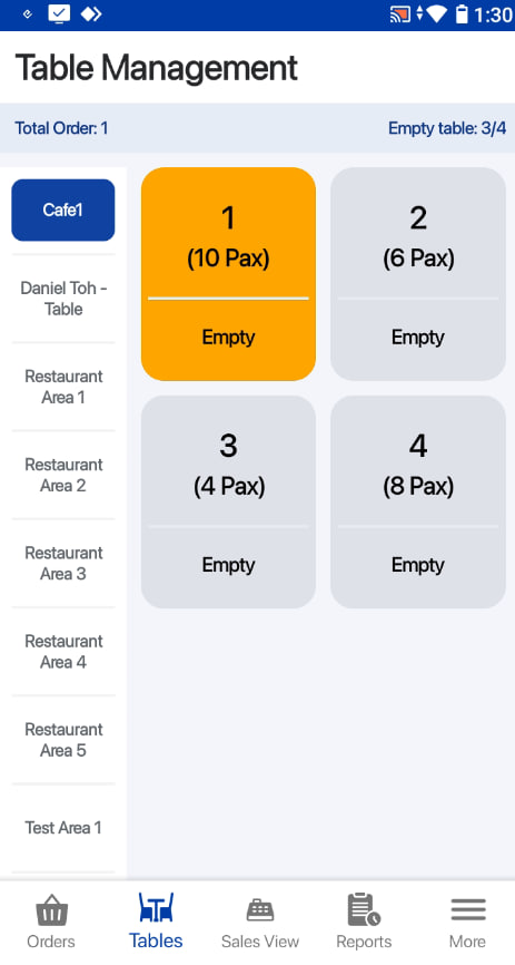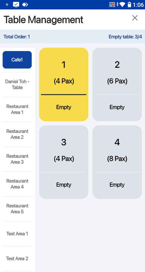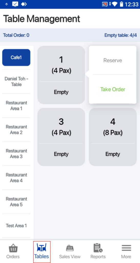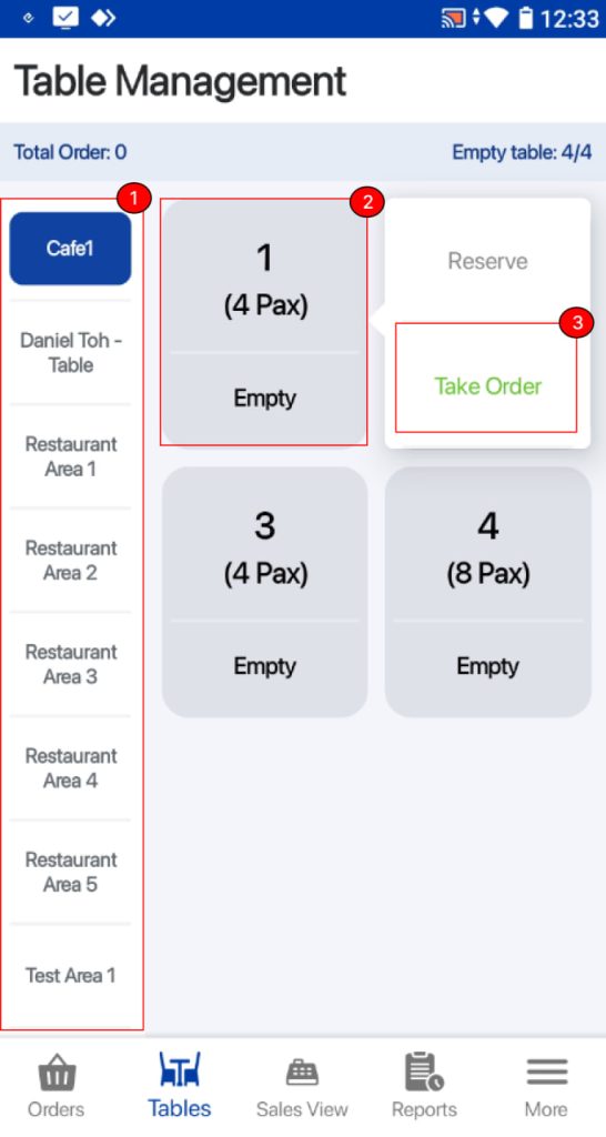 On default table view, users can select an area and table, click on the Take Order button.