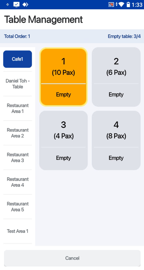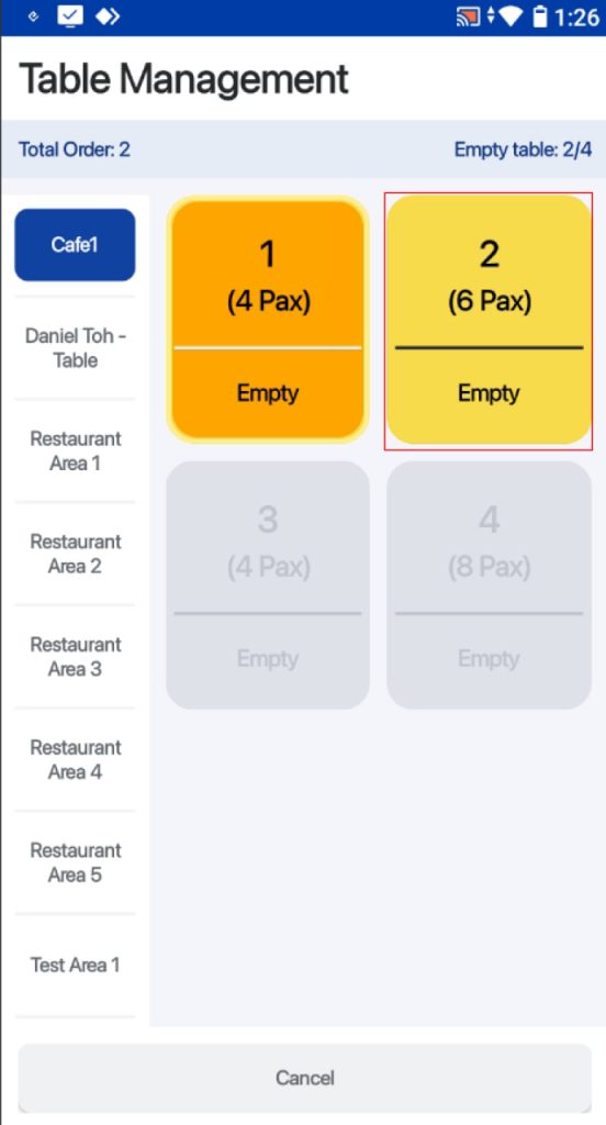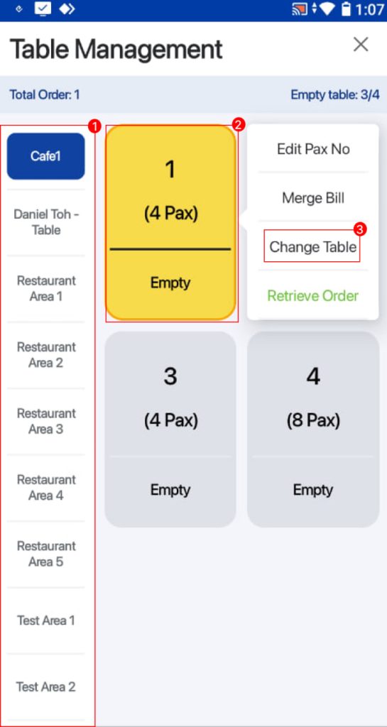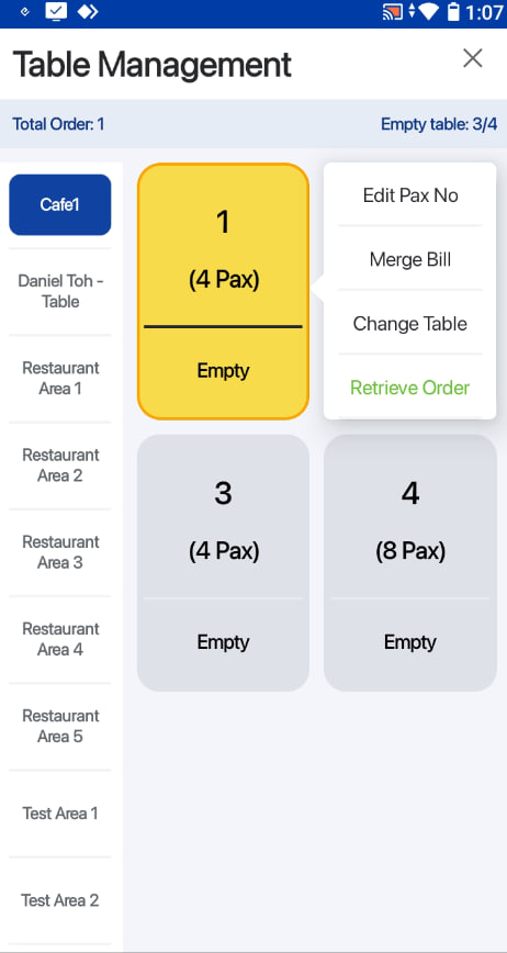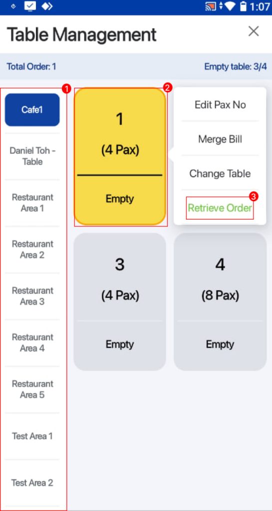 2. Users can select an area and table which they would like to retrieve the order from.