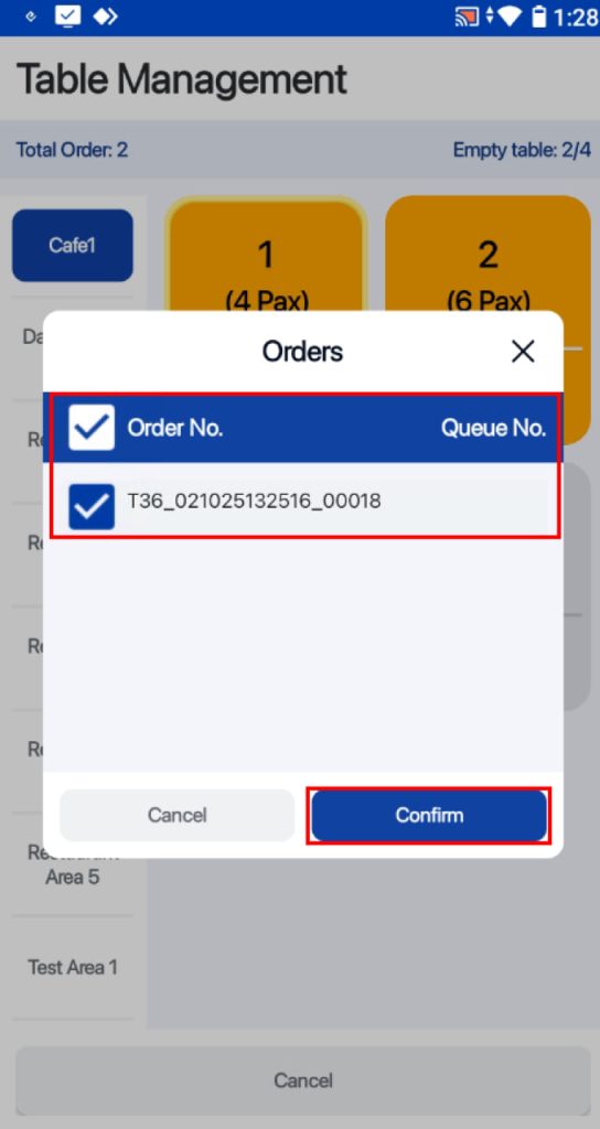 4. Users can click on orders using the checkboxes under the Order No section after selecting the other table and click on the Confirm button to merge bills for both tables.