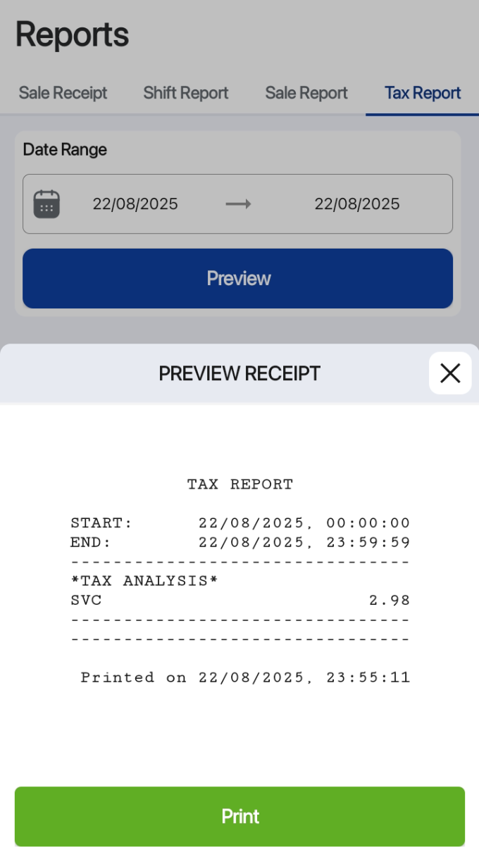 Under the Tax Report section, users can preview and print the Tax Report based on the selected date filter.