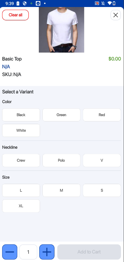 Before a variant is selected, the product details such as price and SKU will be displayed as $0.00 and N/A. This indicates that no specific variant has been chosen yet.