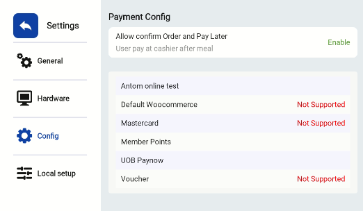 The Payment Config page allows you to easily check which payment methods are supported on your kiosk.