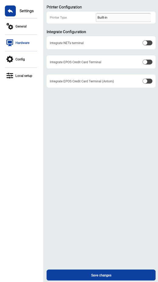 The Hardware Settings page allows you to configure your kiosk’s connected hardware components such as printers and payment terminals.