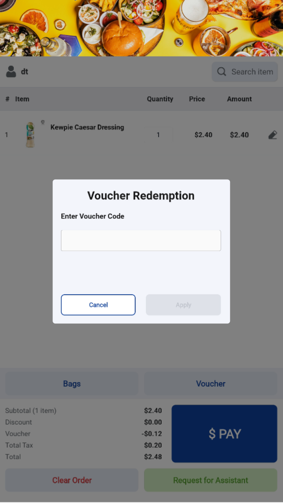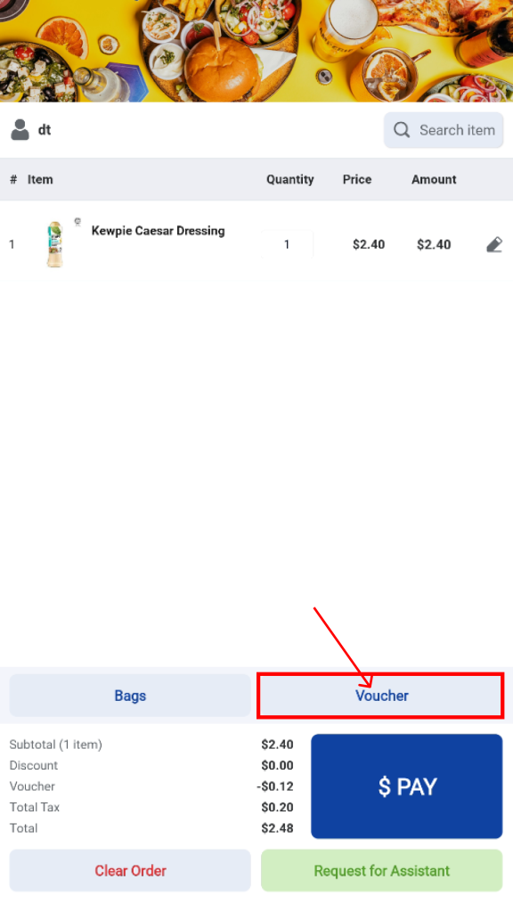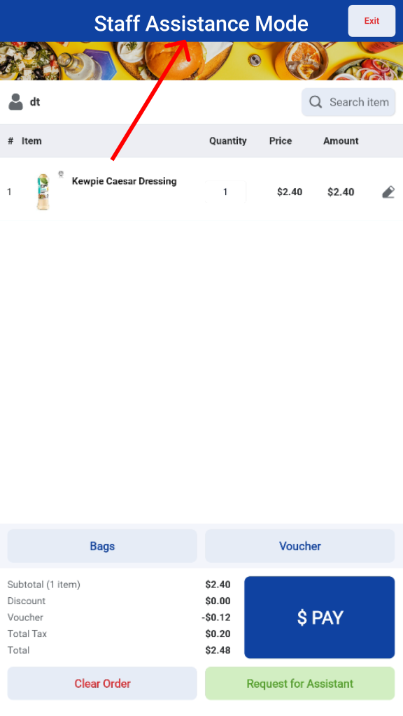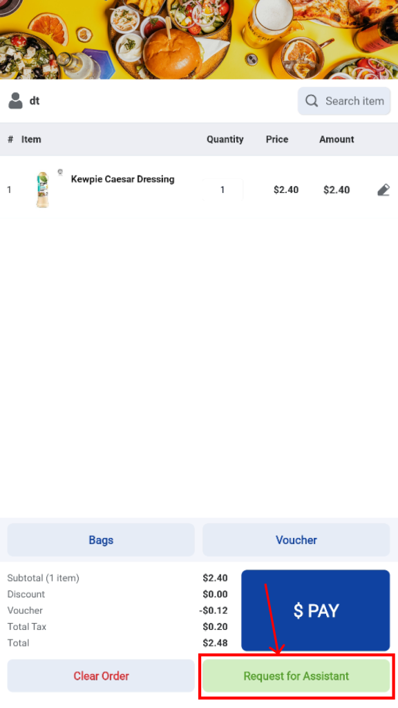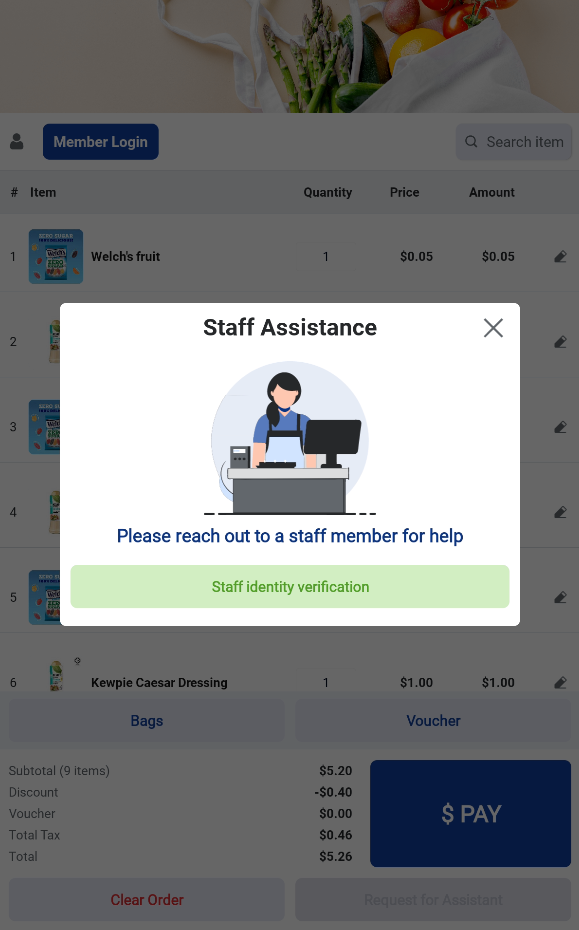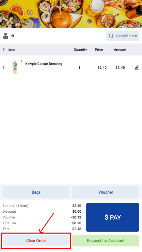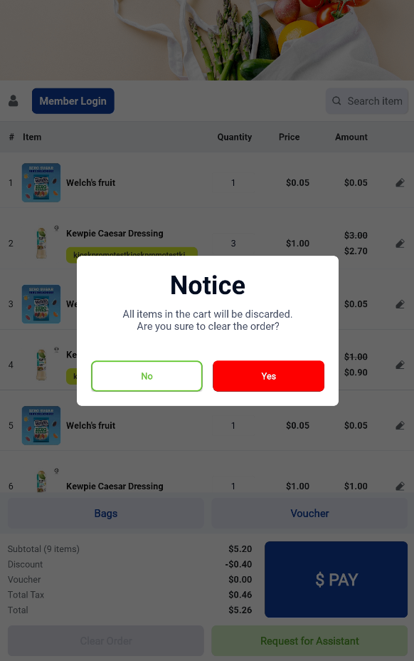 Users may choose to clear the current order at any time. Once the order is cleared, the kiosk will return to the Welcome screen. (Note: merchant can configure whether clearing order will trigger staff assistance mode)