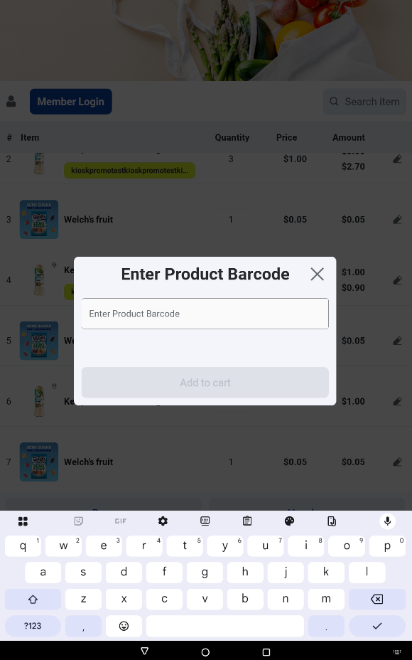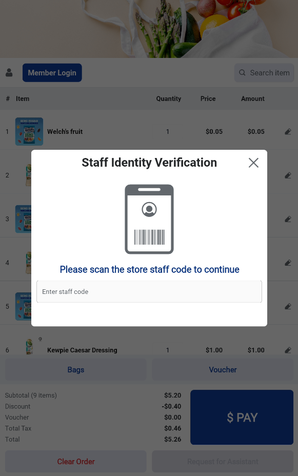 Users can begin the ordering process by scanning product barcodes using the kiosk’s built-in scanner or a connected hand-held scanner.