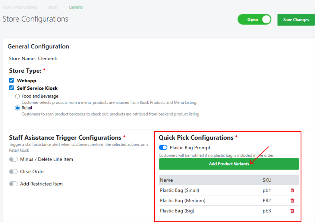 The Quick Pick products popup is a feature available on the Retail Kiosk, it allows merchant to highlight frequently used products such as bags, so customers can easily select them during checkout without searching for it.