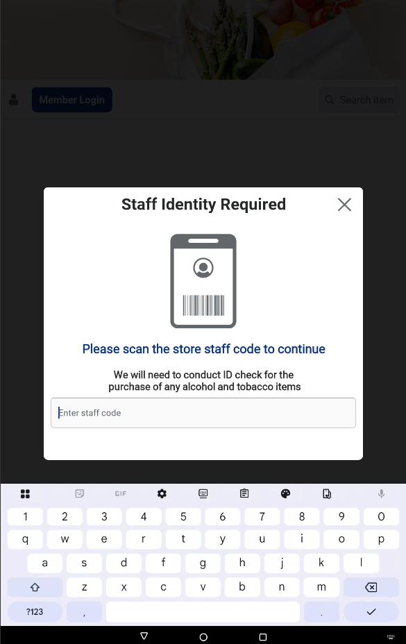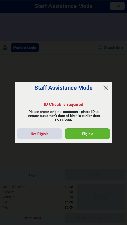 Staff must authenticate themselves at the kiosk to proceed. After successful verification, the system will display a reminder for staff to confirm the customer’s age eligibility before allowing the purchase to continue.