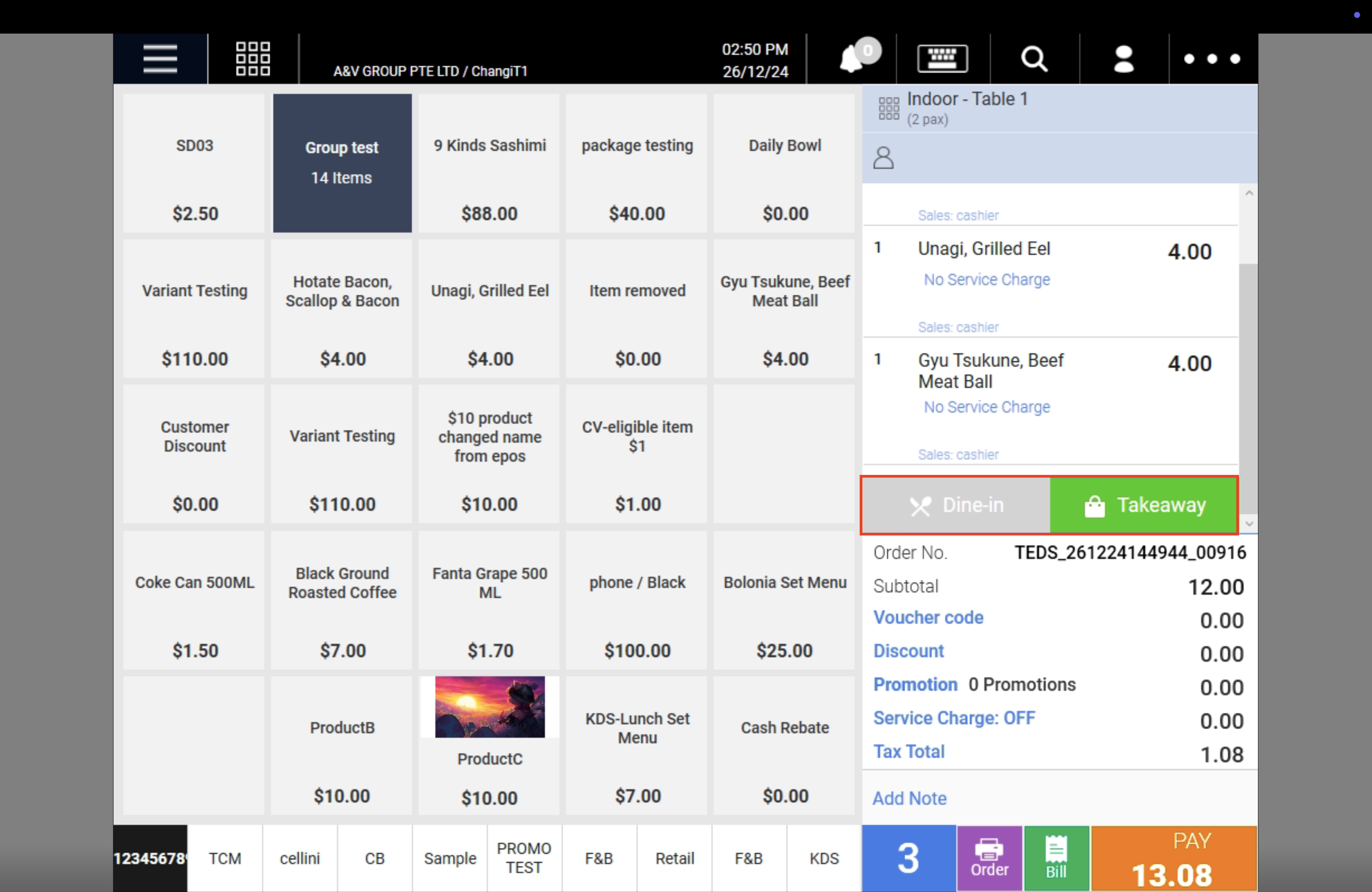 This ensures the kitchen slip and the Kitchen Display System (KDS) show the correct dining label: “Takeaway” or “Dine-in.”