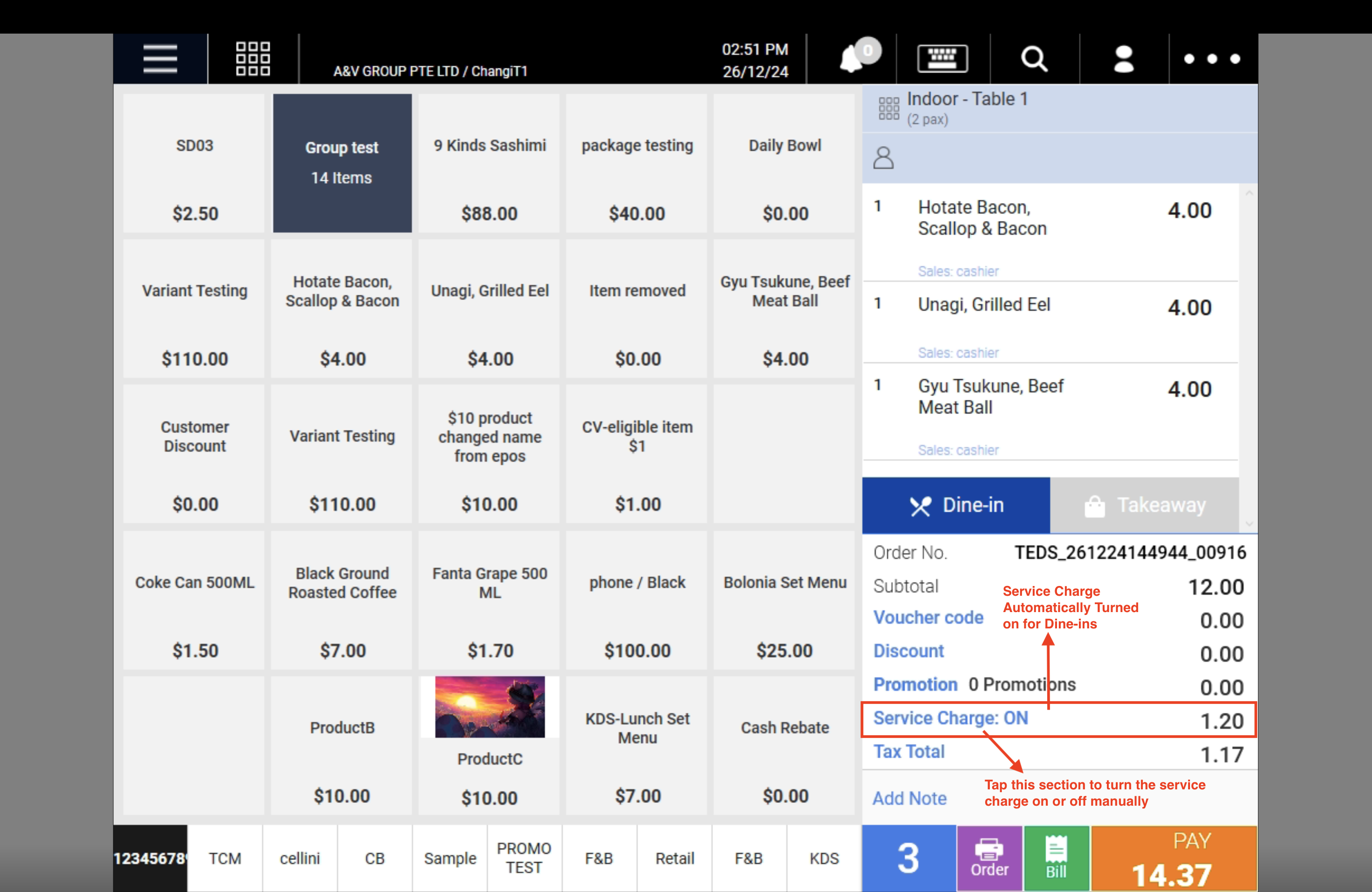 3(ii). For Takeaway: Service charges are removed automatically but can be added back by cashiers if needed.