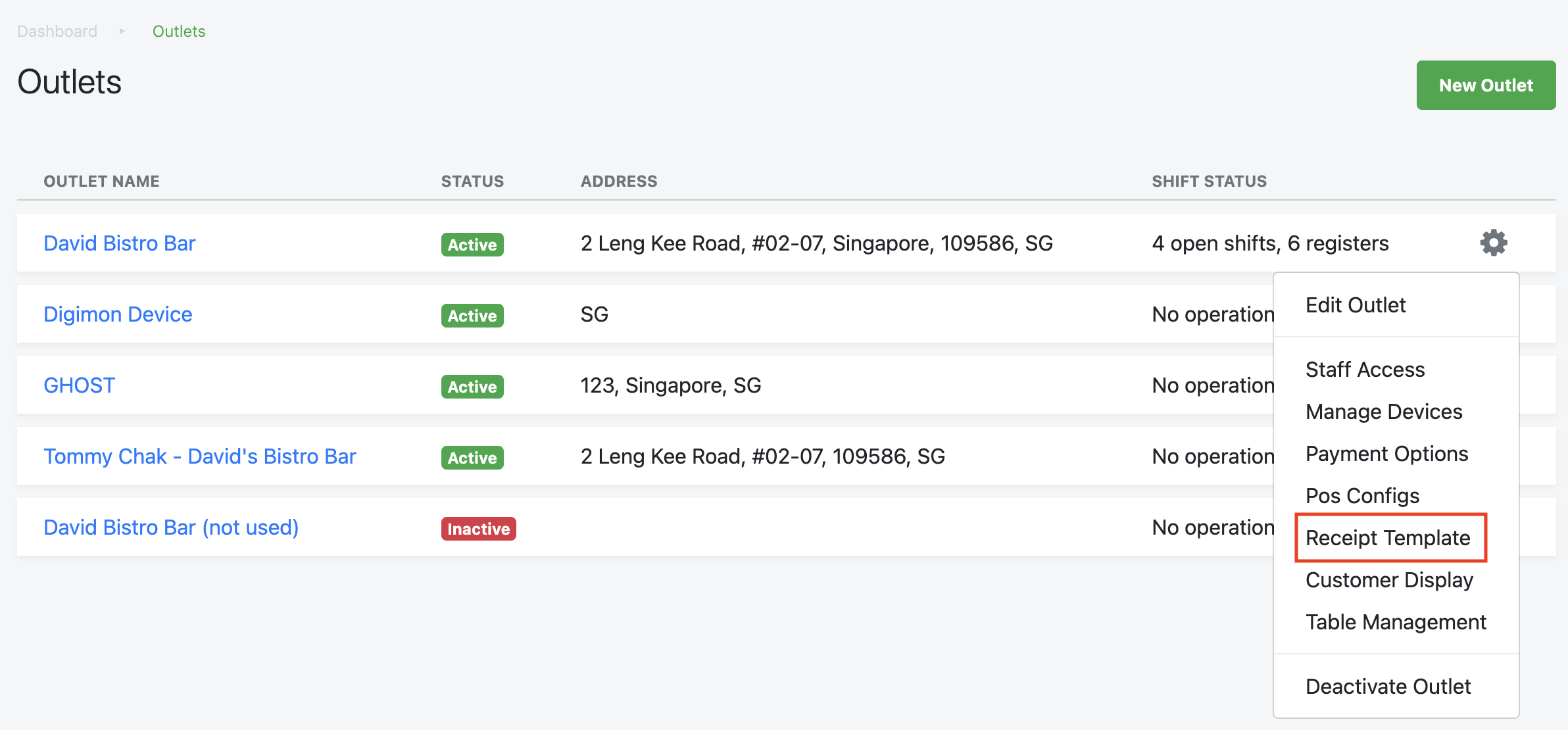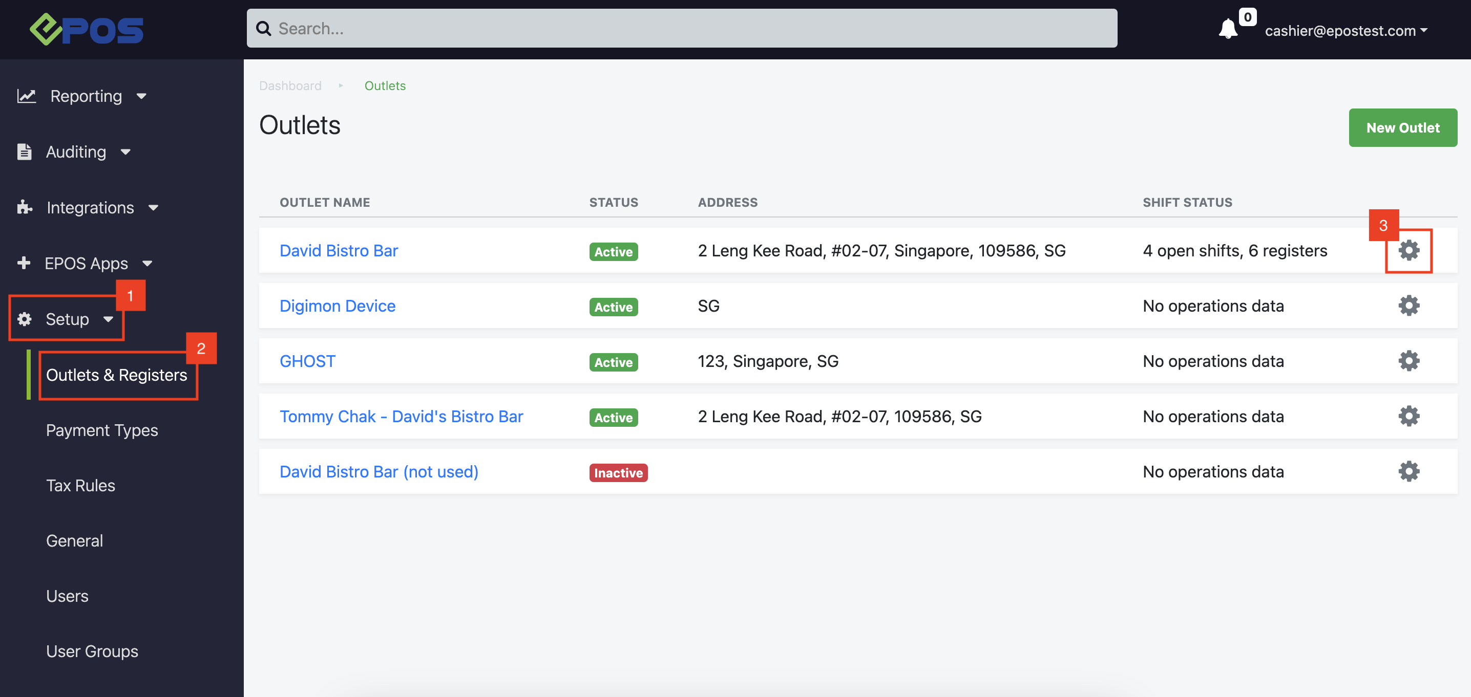 In order to enable the queue status display on the receipt, users can click on the Outlets & Registers tab under Setup. After entering this page, users can click on the settings icon.
