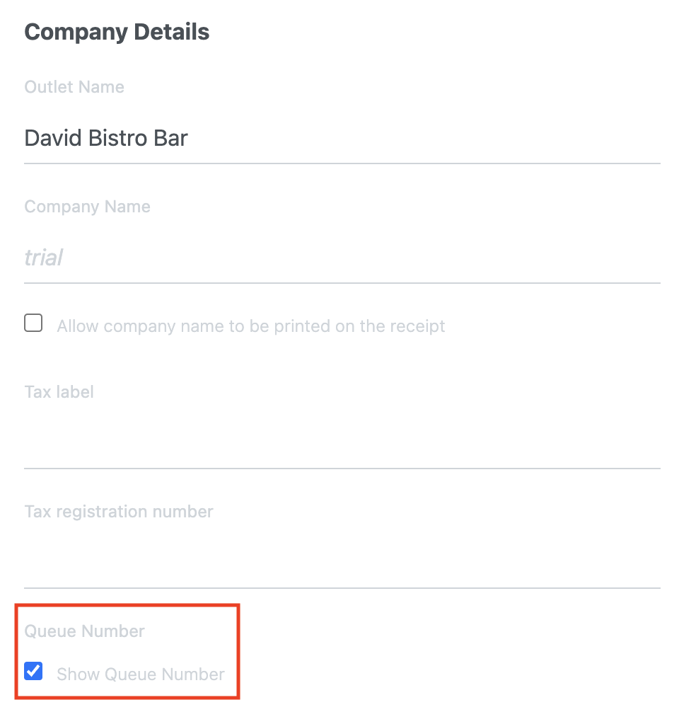 Upon completion, scroll to Company Details section, under Queue Number, click on the check box to enable Show Queue Number to enable queue status display.