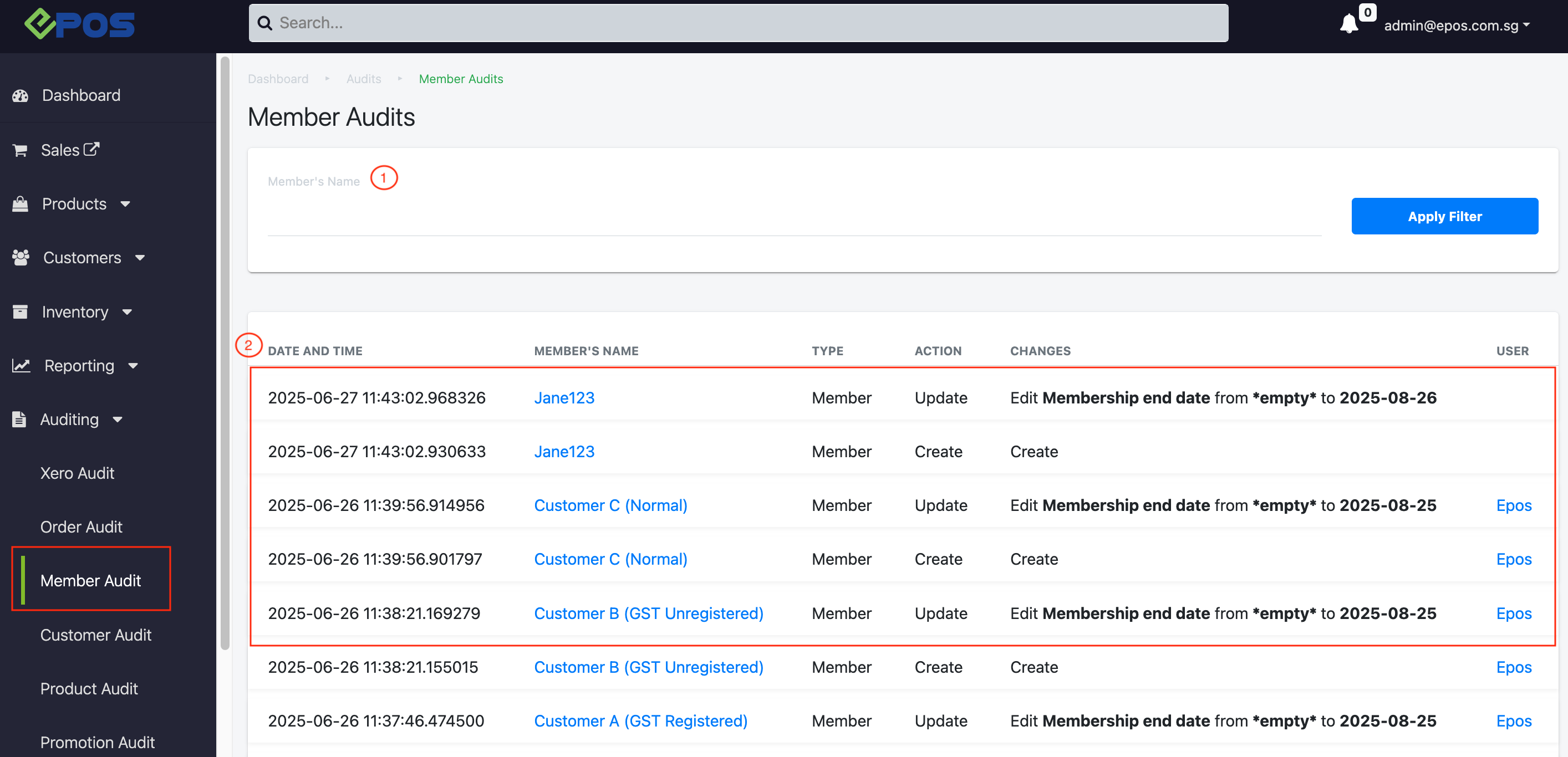 Allow users to generate an Member Audit report based on a specific member. Click on Apply Filter to generate a report. - Audit Report