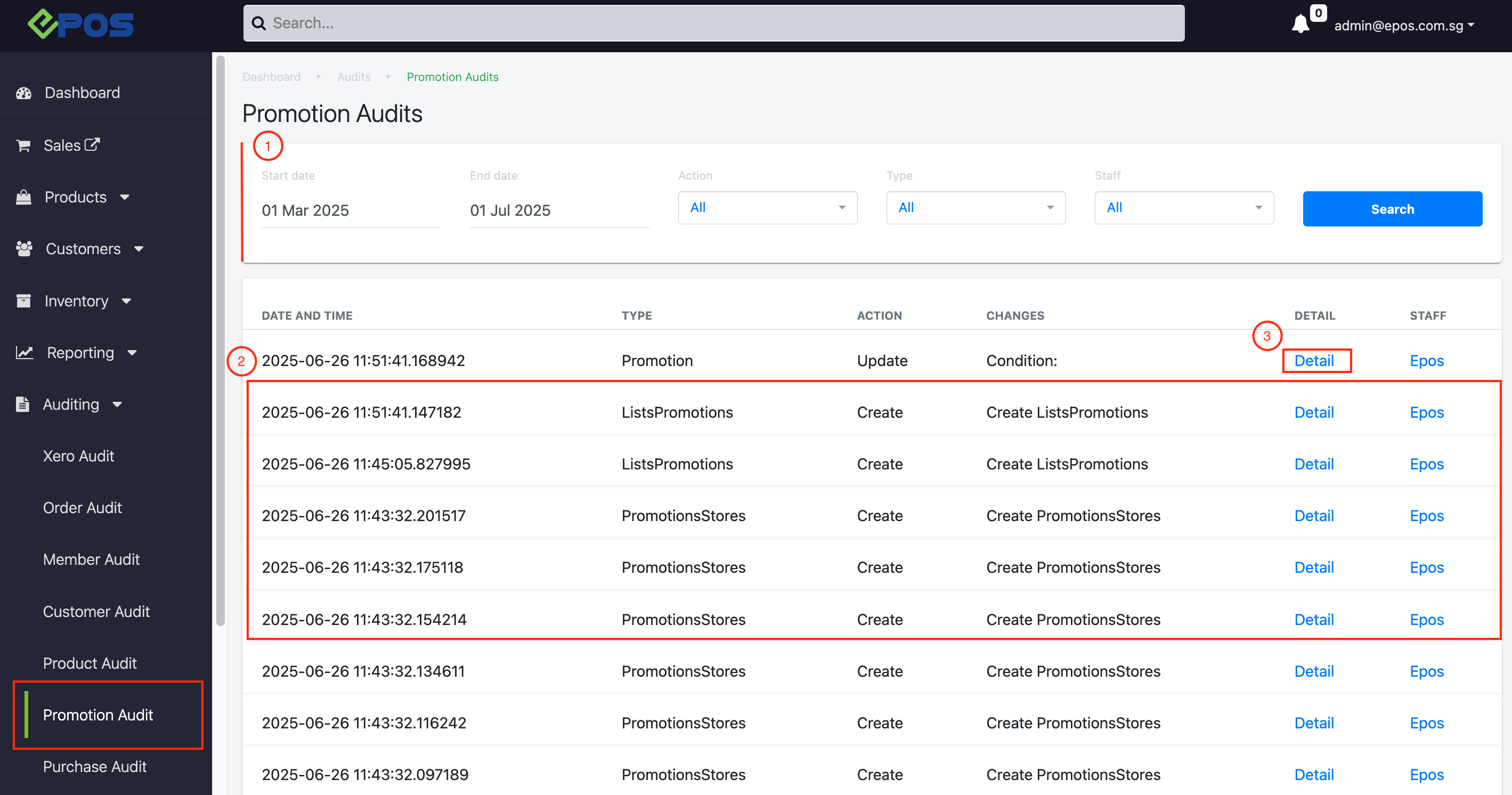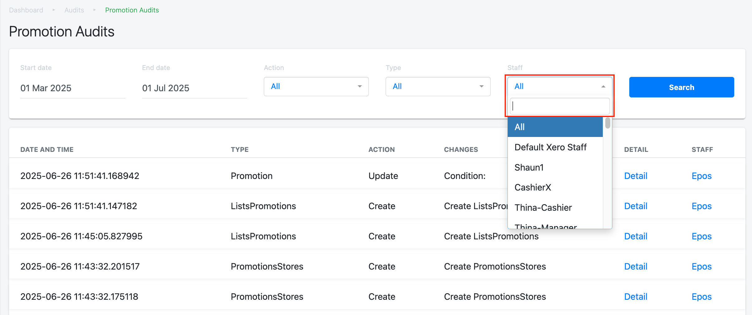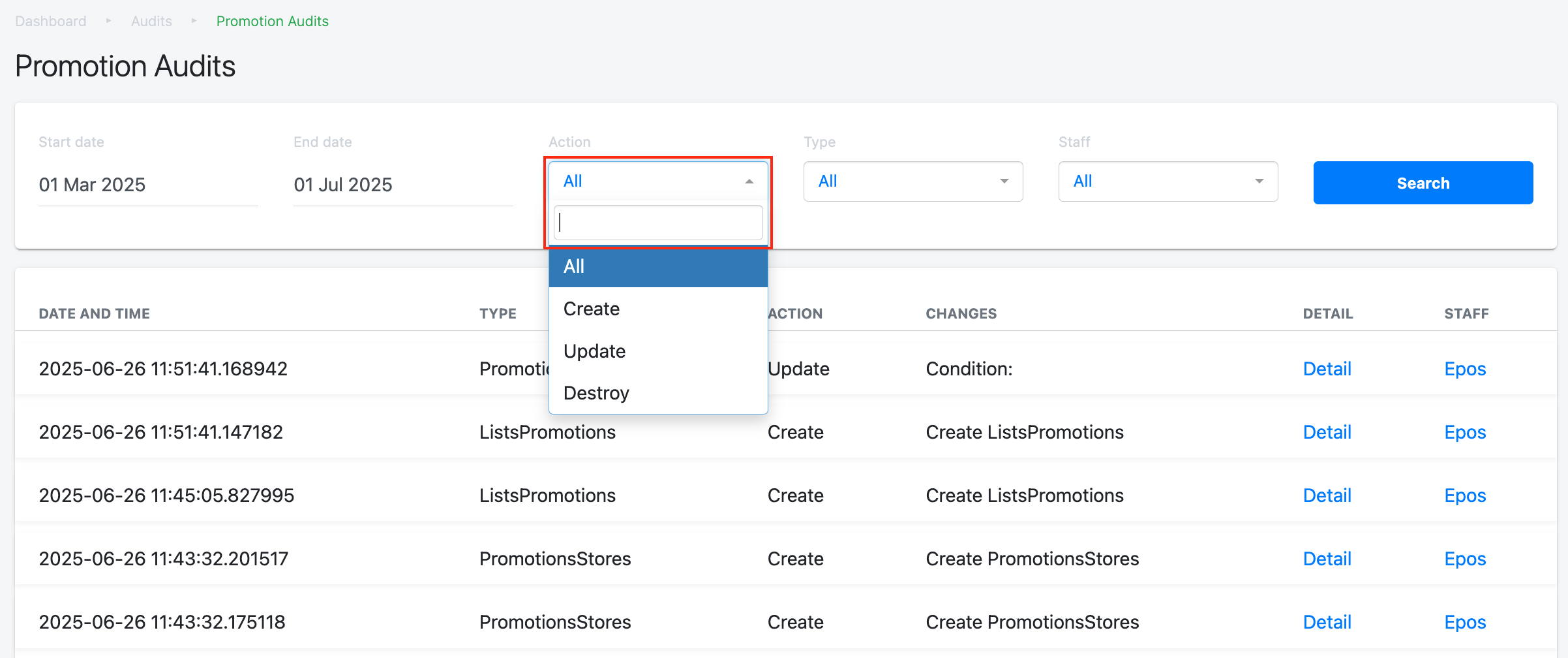 Allow users to search and filter the promotion audit report based on product name/SKU, action type, type and specific date range.