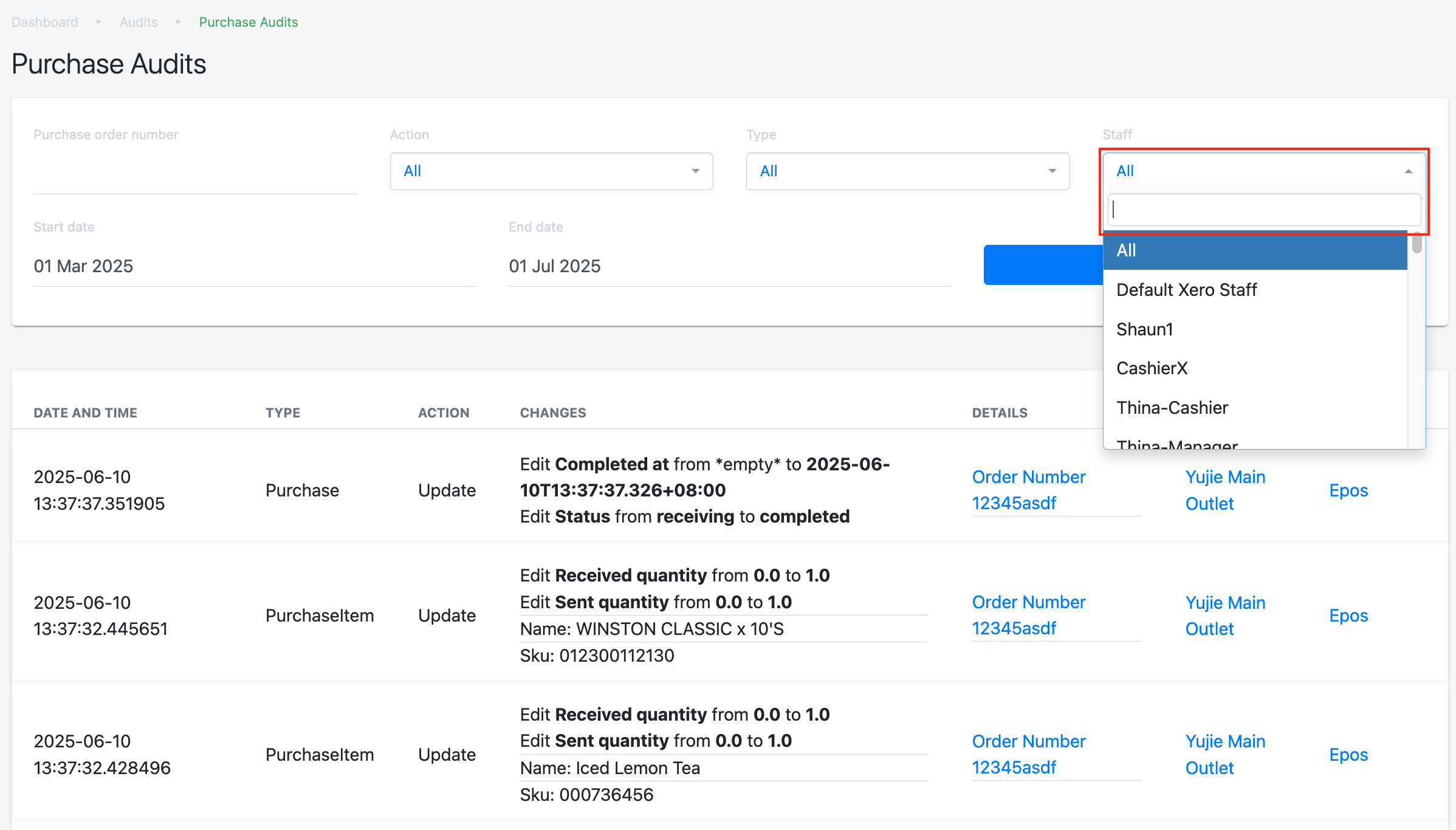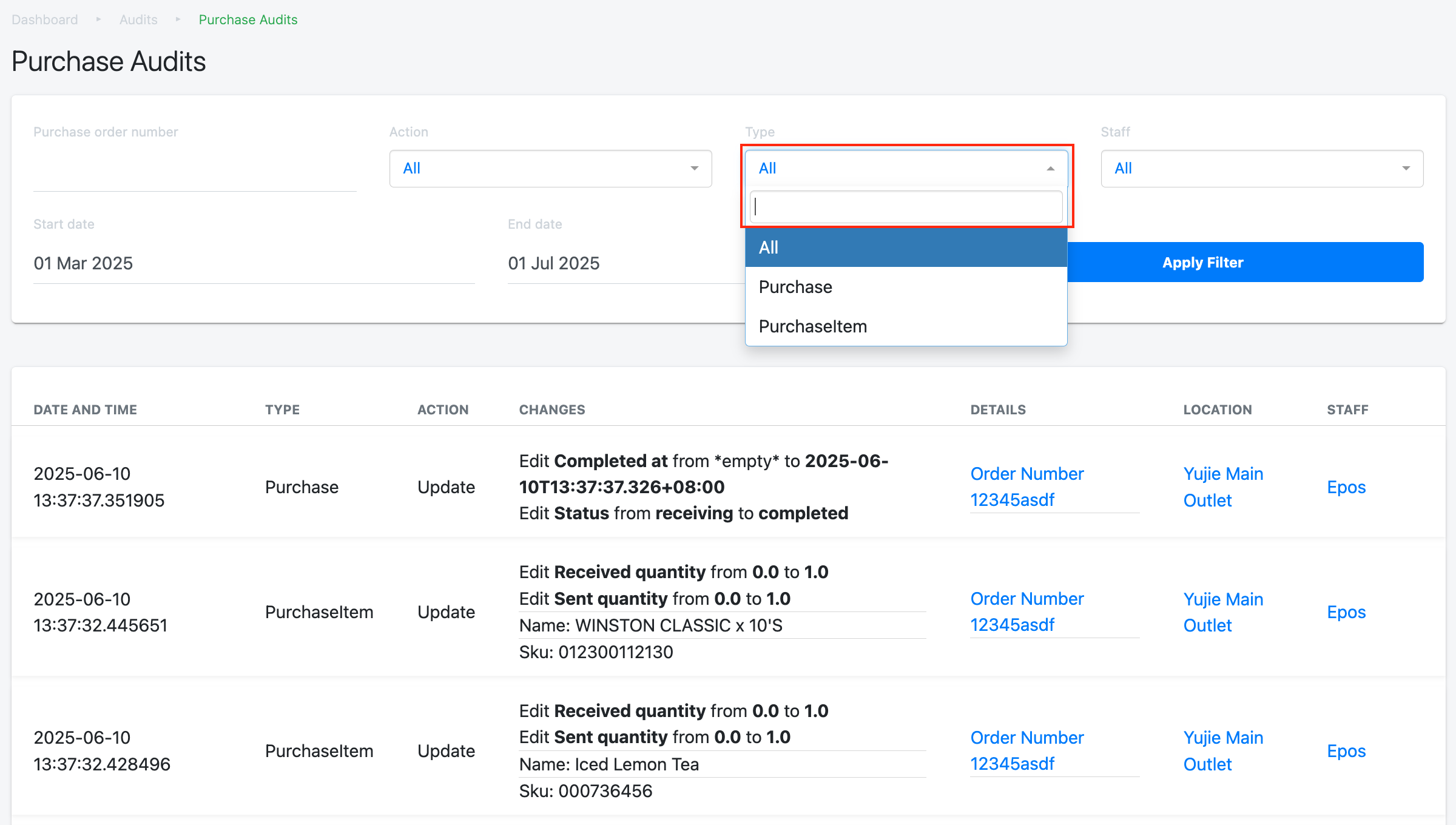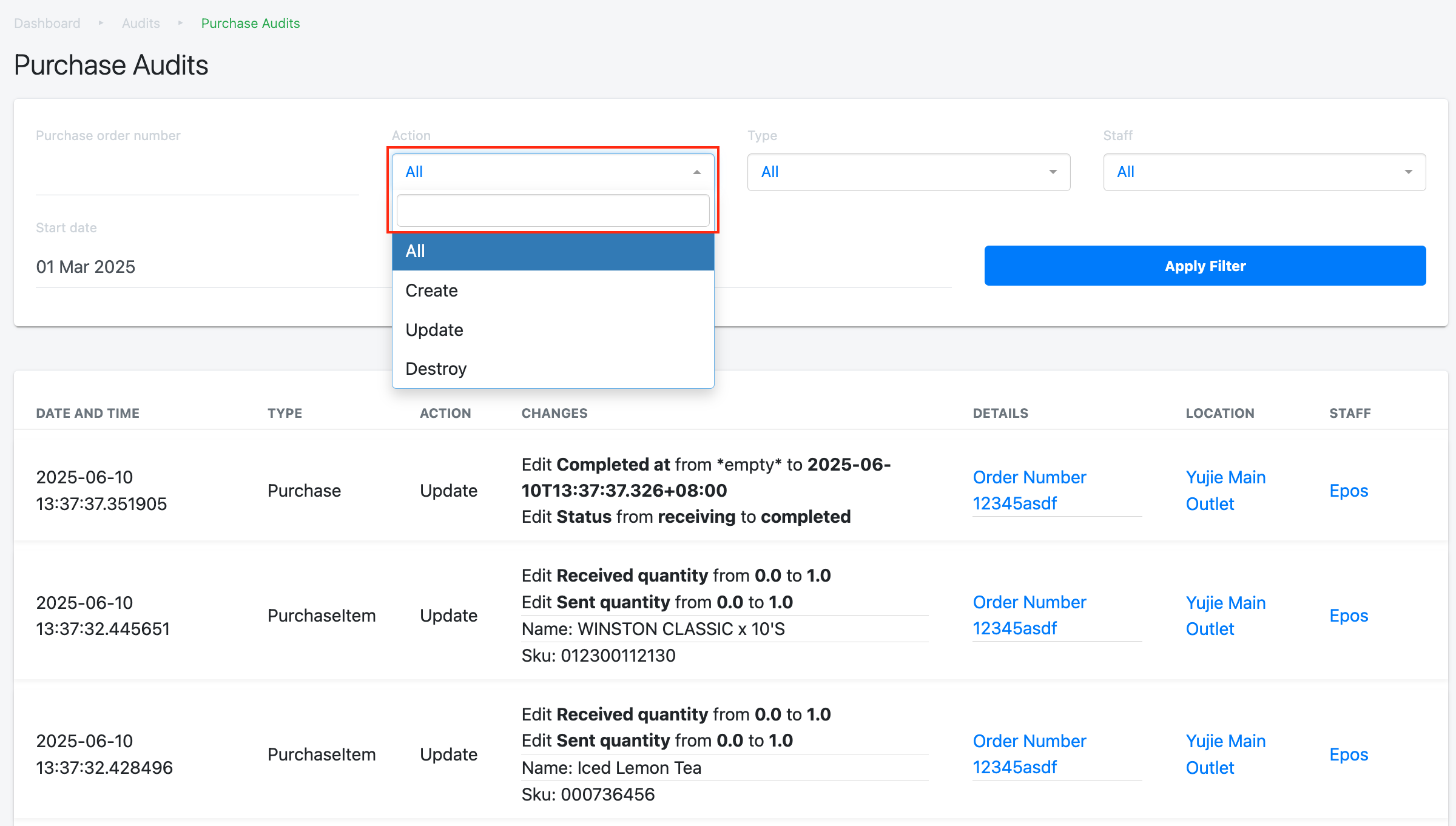 Allow users to search and filter the purchase audit report based on PO number, action type (Create, Update, Destroy), type (purchase. Purchase item), staff, and specific date range.
