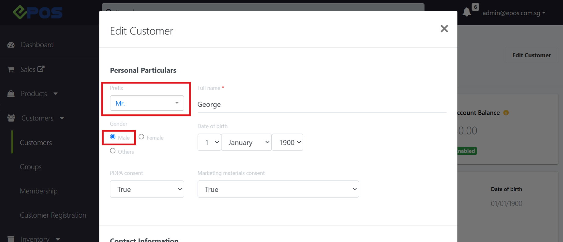 Note: If Female is selected, the system will automatically set the title to Ms. If no gender is selected during customer creation, both the title and gender will be left blank in the backend.
