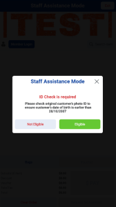 Users can define which actions (e.g., purchasing restricted products like alcohol or tobacco) automatically prompt a staff member for assistance. Staff can then scan their employee barcode to quickly verify their identity and approve the transaction.