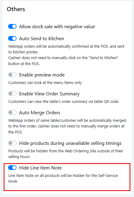 - When this option is enabled, line item note will be hidden on all products on your kiosks