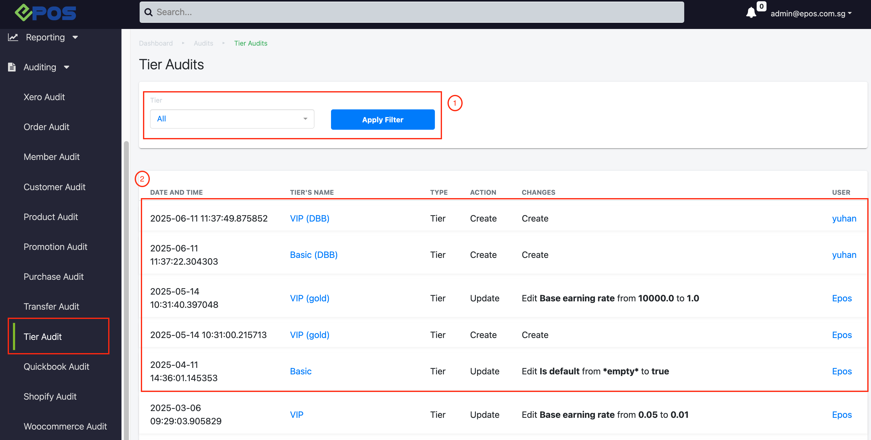 Tier Audit provides the history log and details on the changes made to membership tiers registered in the database.